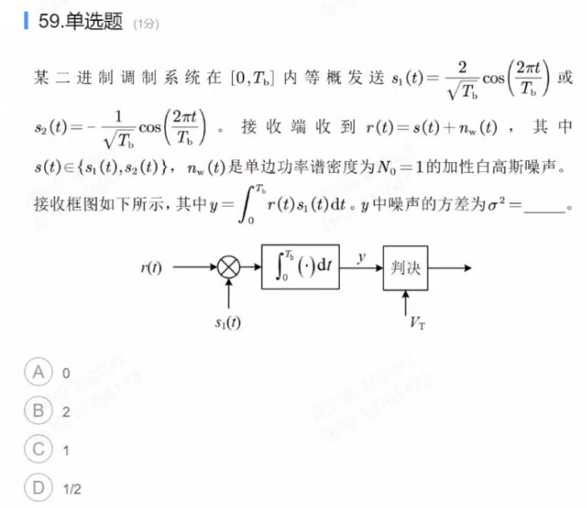59. 某二进制调制系统在 [0,Zu]内等概发送 s,()os或s()=-元co元)。接收端收到 r()=()+n(),其中s(t)e{s;(t),82(t),n(t)是单边功率谱密度为N=1的加性白高斯噪声。接收框图如下所示,其中y=rt)s(t)dt。y中噪声的方差为2=
