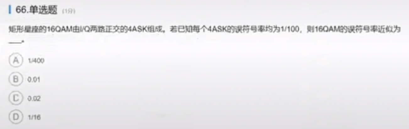 66. 矩形星座的16QAM由/Q两路正交的4ASK组成,若已知每个4ASK的误符号率均为1/100,则16QAM的误符号率近似为