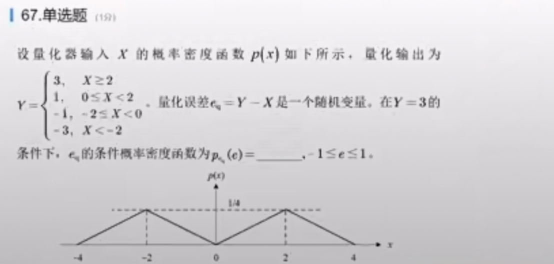 67. 设量化器输入 X 的概率密度函数 px) 如所示,量化输出为,量化误差=Y是一个随机变量。在Y=3的1条件下,的条件概率密度函数为p_(e)=,-1Se1。