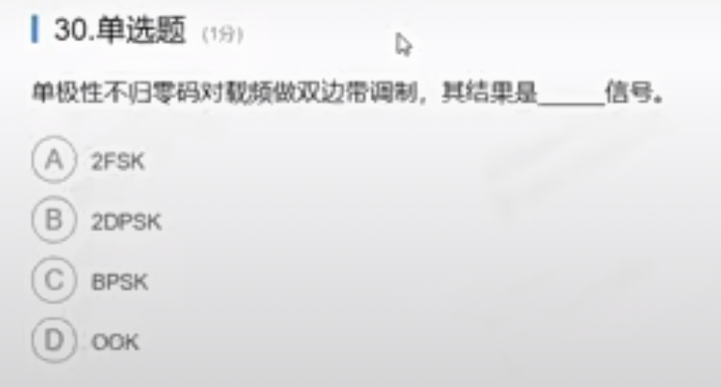 30. 单极性不归零码对载频做双边带调制,其结果是_信号。