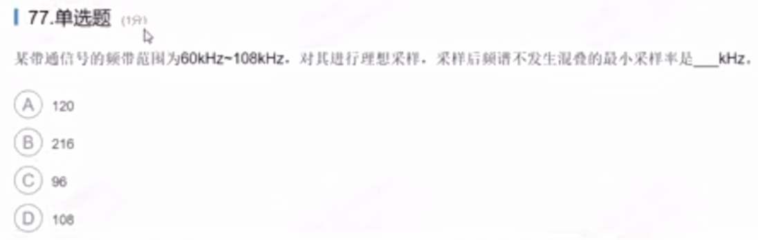 77. 某带通信号的频带范围为60kHz-108kHz,对其进行理想采样,采样后频谱不发生混叠的最小采样率是_ kHz