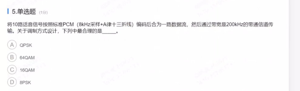 5. 将10路话音信号按照标准PCM (8kHz采样+A律十三折线)编码后合为一路数据流,然后通过带宽是200KHz的带通信道传输。关于调制方式设计,下列中最合理的是