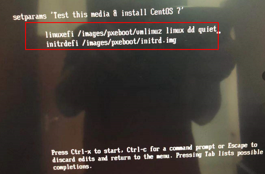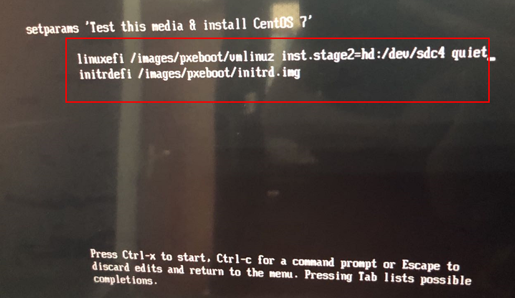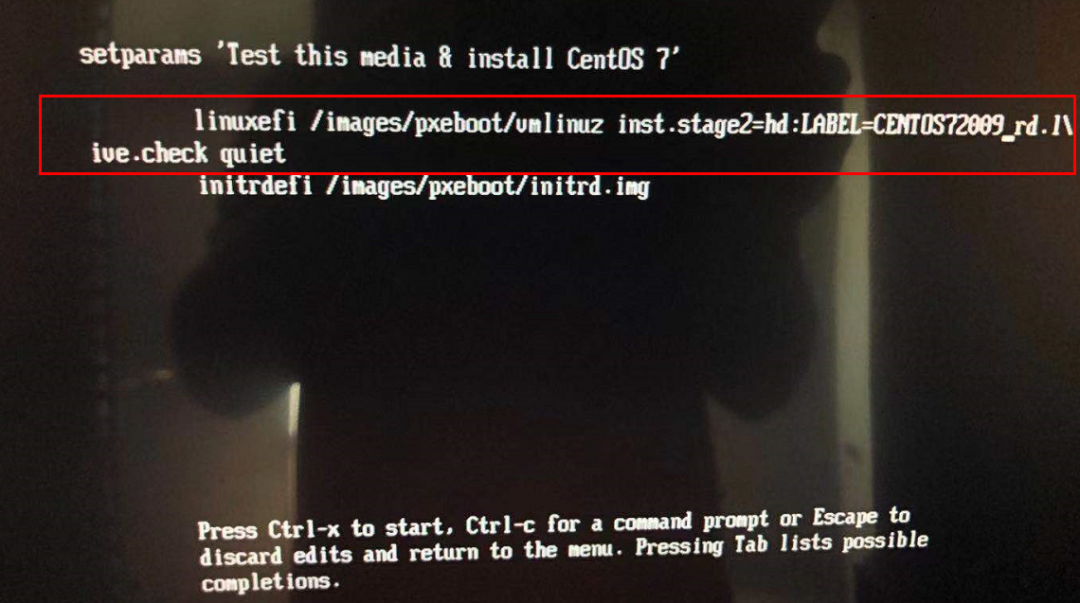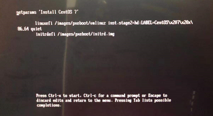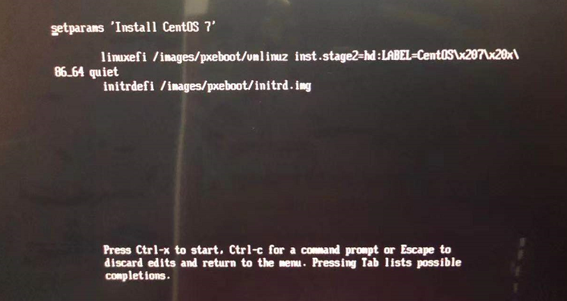 1linuxefi /images/pxeboot/vmlinuz inst.stage2=hd:LABEL=CentOS\x207\x20x\86_64 quiet