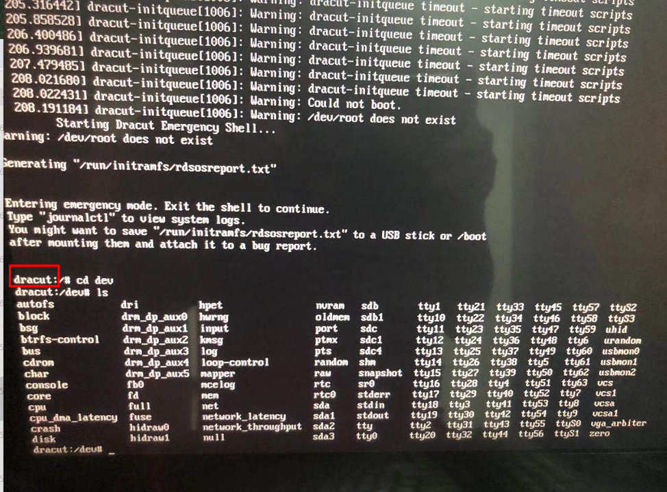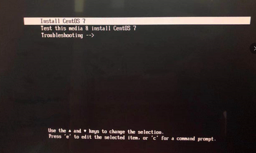 若不把光标光标定位到“Insall Centos 7”选项,直接装机,安装好重启后,则会出现黑屏,屏幕左上角显示“4m[terminated]”,只有光标一直在闪,进入不了系统的问题。若直接强行重启,服务器则会出现以下问题。