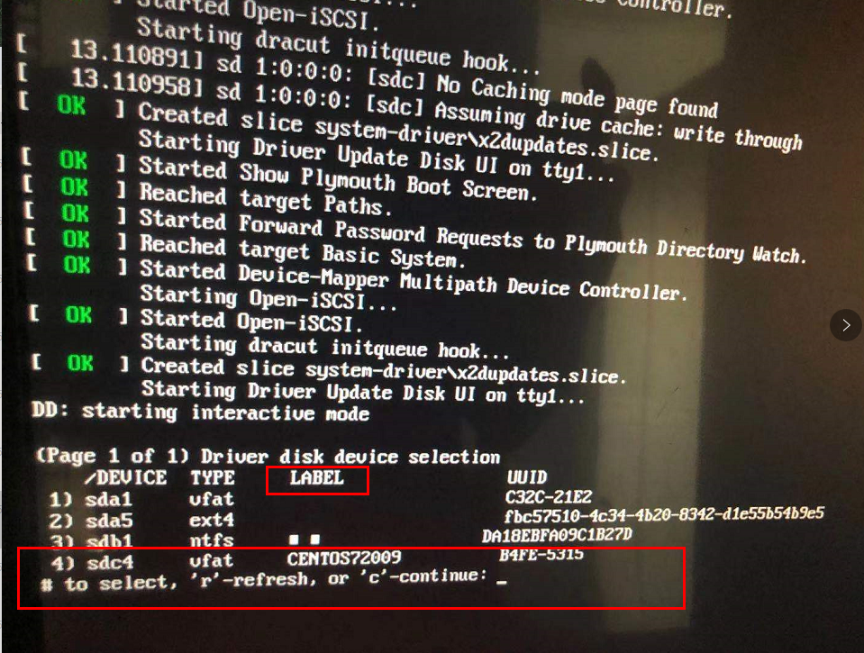 此时记录好sdc4和CENTOS72009 ,然后,根据提示按c键继续,等待程序进入drauct