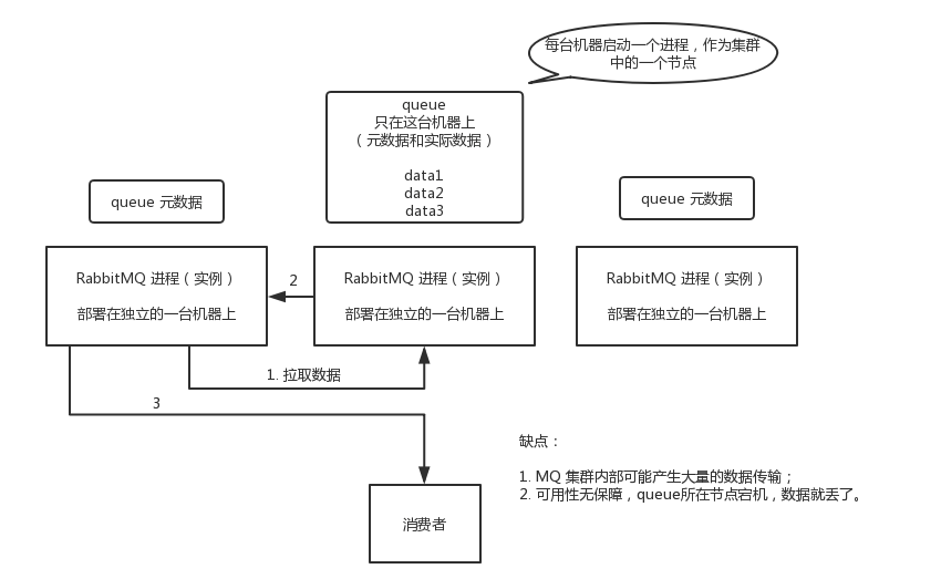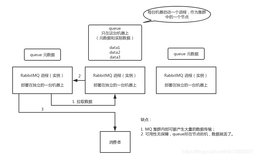 普通集群模式,意思就是在多台机器上启动多个 RabbitMQ 实例,每个机器启动一个。你创建的 queue,只会放在一个 RabbitMQ 实例上,但是每个实例都同步 queue 的元数据(元数据可以认为是 queue 的一些配置信息,通过元数据,可以找到queue 所在实例)。你消费的时候,实际上如果连接到了另外一个实例,那么那个实例会从 queue 所在实例上拉取数据过来。