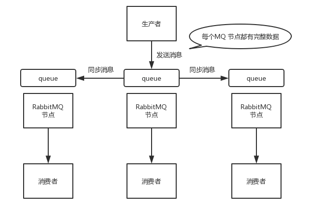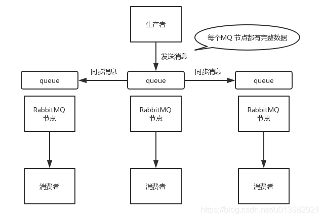 这样的话,好处在于,你任何一个机器宕机了,没事儿,其它机器(节点)还包含了这个 queue 的完整数据,别的 consumer 都可以到其它节点上去消费数据。坏处在于,第一,这个性能开销也太大了吧,消息需要同步到所有机器上,导致网络带宽压力和消耗很重!第二,这么玩儿,不是分布式的,就没有扩展性可言了,如果某个 queue 负载很重,你加机器,新增的机器也包含了这个 queue 的所有数据,并没有办法线性扩展你的 queue。你想,如果这个 queue 的数据量很大,大到这个机器上的容量无法容纳了,此时该怎么办呢?
