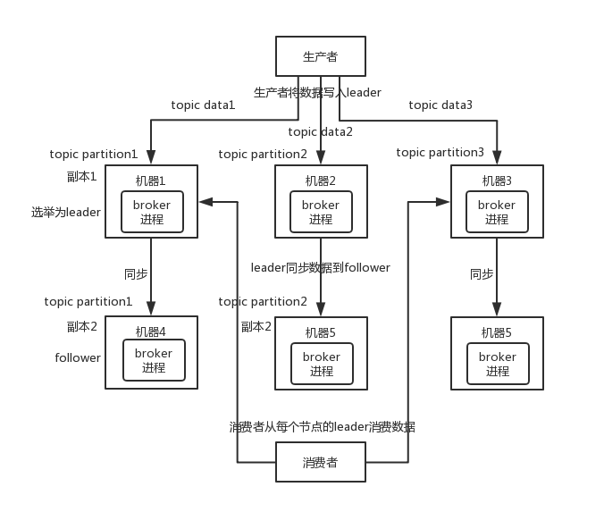 比如说,我们假设创建了一个 topic,指定其 partition 数量是 3 个,分别在三台机器上。但是,如果第二台机器宕机了,会导致这个 topic 的 1/3 的数据就丢了,因此这个是做不到高可用的。