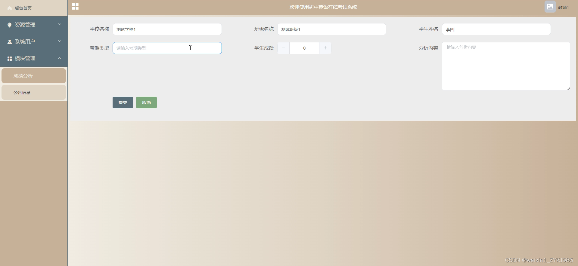 | 点击搜索成绩分析,输入存在的成绩分析名 | 查找出成绩分析 | 与预期结果一致 |