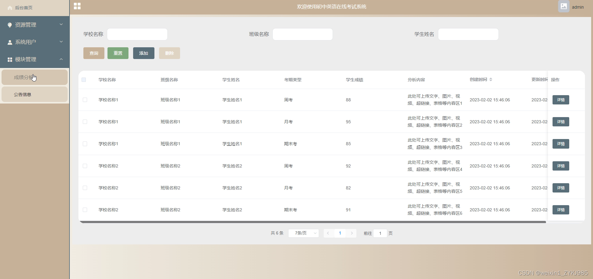根据需求,需要对成绩分析管理进行添加、删除或修改详情信息。删除或修改成绩分析管理时,系统根据成绩分析管理的状态判定为可删除状态下,才会给出删除和修改链接,点击删除链接按钮时,请求到达后台,还会先查询成绩分析管理状态再次做出判定能否删除。点击修改链接按钮时,会跳转到修改信息的页面,重新填写好数据后,数据提交到后台会对数据库中相应的记录做出修改。