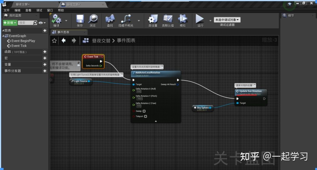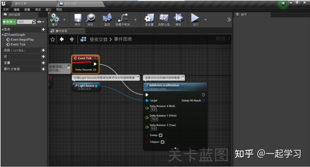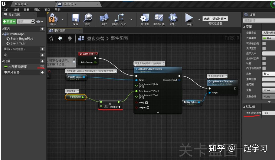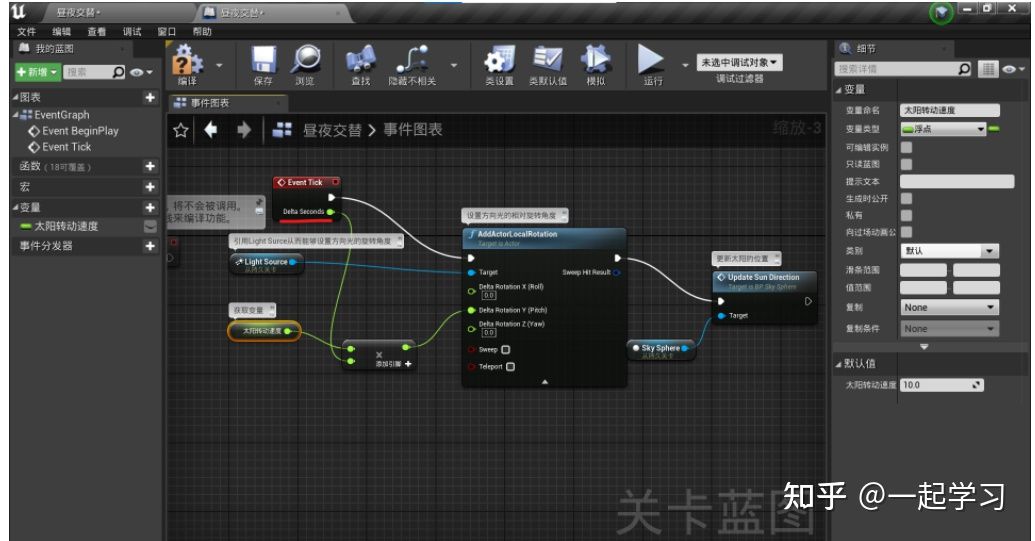 - Event Tick中的Delta Seconds可以用来控制太阳的转动速度;