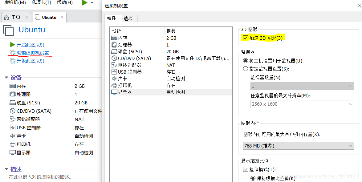 重新开启vmware后,在还没有打开虚拟机的情况下,在“编辑虚拟机设置”->硬件->显示器里,把加速3D图形的√取消掉