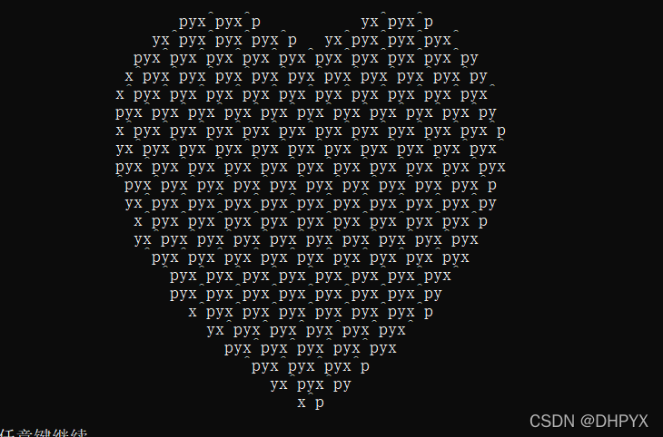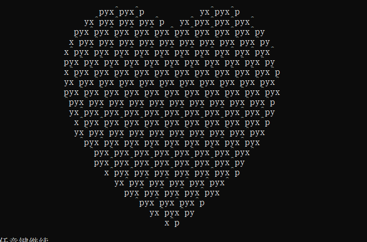 {int s=0;float x, y;for (x = 1.3; x >= -1.1; x -= 0.1){for (y = -2; y <= 1.4; y += 0.053){if (pow(x * x + y * y - 1, 3) - x * x * x * y * y <= 0){s++;if (s % 4 == 1)printf("p");if (s % 4 == 2)printf("y");if (s % 4 == 3)printf("x");if (s % 4 == 0)printf("^");Sleep(0.99);}elseprintf(" ");}printf("\n");}