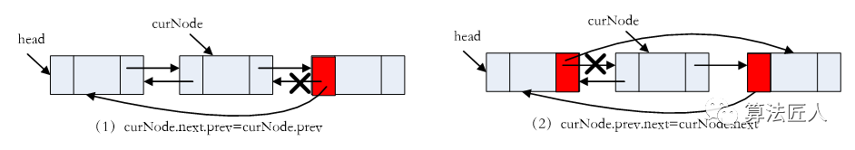 (2)修改curNode结点的前驱结点的next指针curNode.prev.next和后继结点的prev指针curNode.next.prev,从而删除curNode结点。如图7所示。