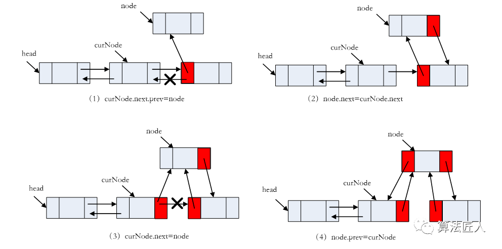 (3)修改4个指针域实现结点的插入:curNode.next.prev,node.next,node.prev,curNode.next。如图5所示。