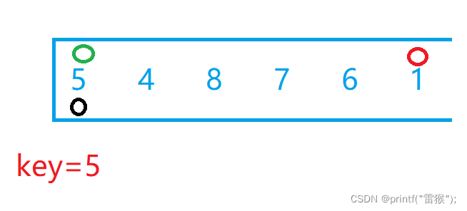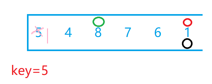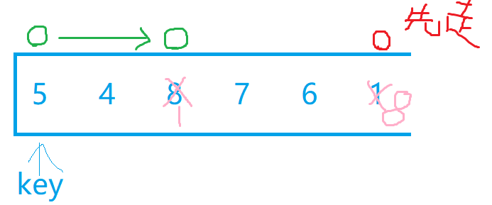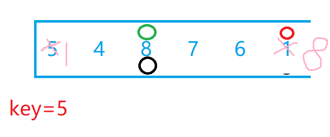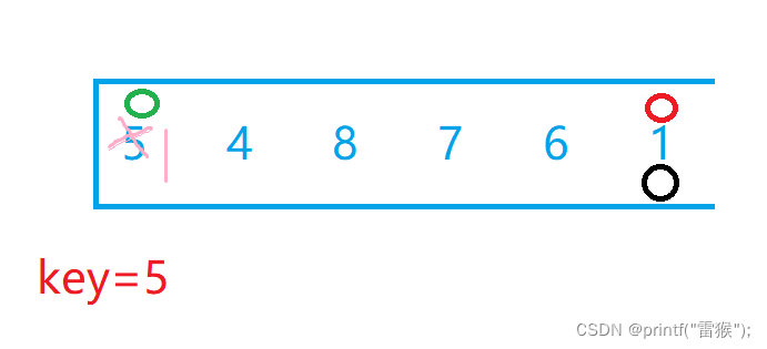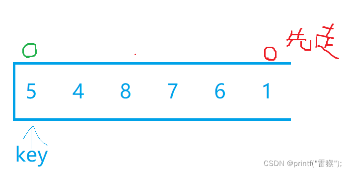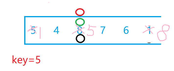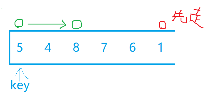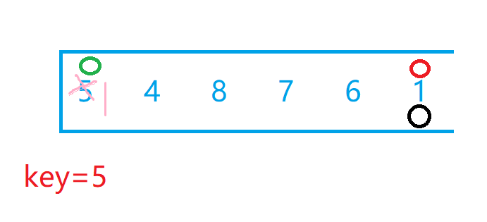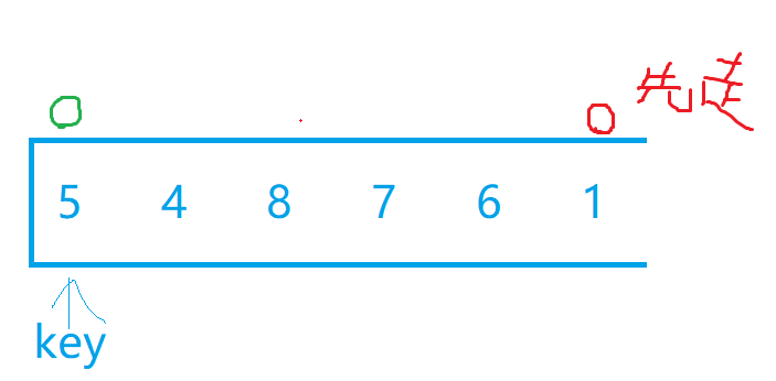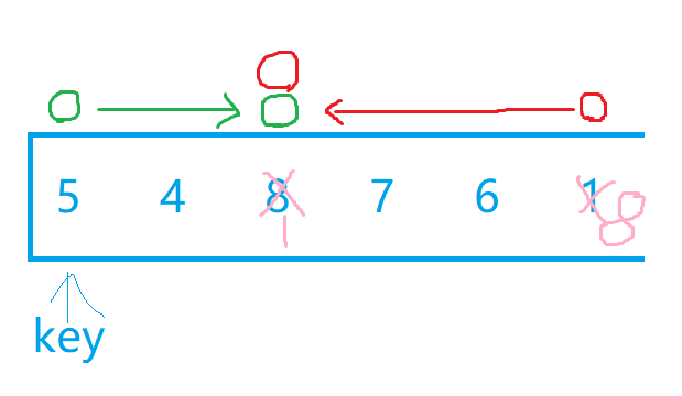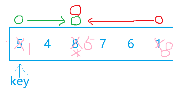 我们选最左边为key值后,假设现在有两个小兵分别站在最左边和最右边,我们让最右边的小兵先走,他的任务是找比key所在位置的值小的数,找到后停下,左边的小兵再开始走,他的任务则是找比key所在位置大的数,找到后停下。交换两个小兵所在位置的数,然后重复上述步骤直到两个小兵相遇,两个小兵相遇后再交换相遇位置的数和key值所在位置的数。下面我们自己画图来理解一下,下面绿色代表左边小兵,红色代表右边小兵