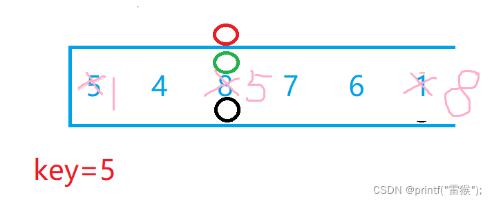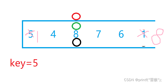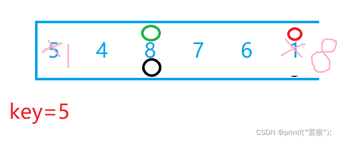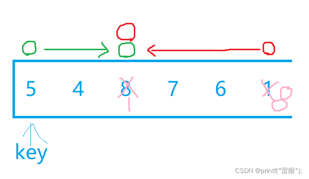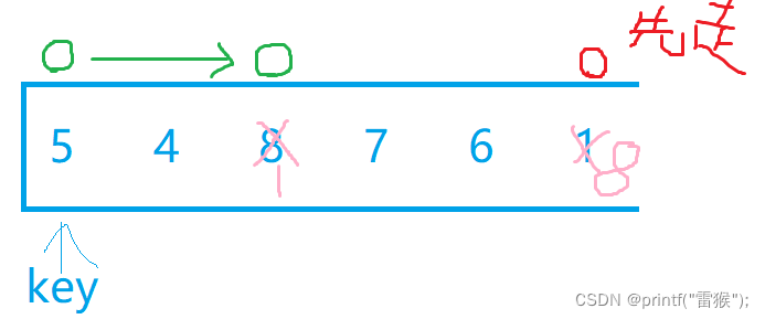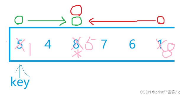 {int key = left;while (left < right){//找小while (left < right && a[right] >= a[key]){--right;}//找大while (left < right && a[left] <= a[key]){++left;}Swap(&a[right], &a[left]);}Swap(&a[key], &a[left]);return left;