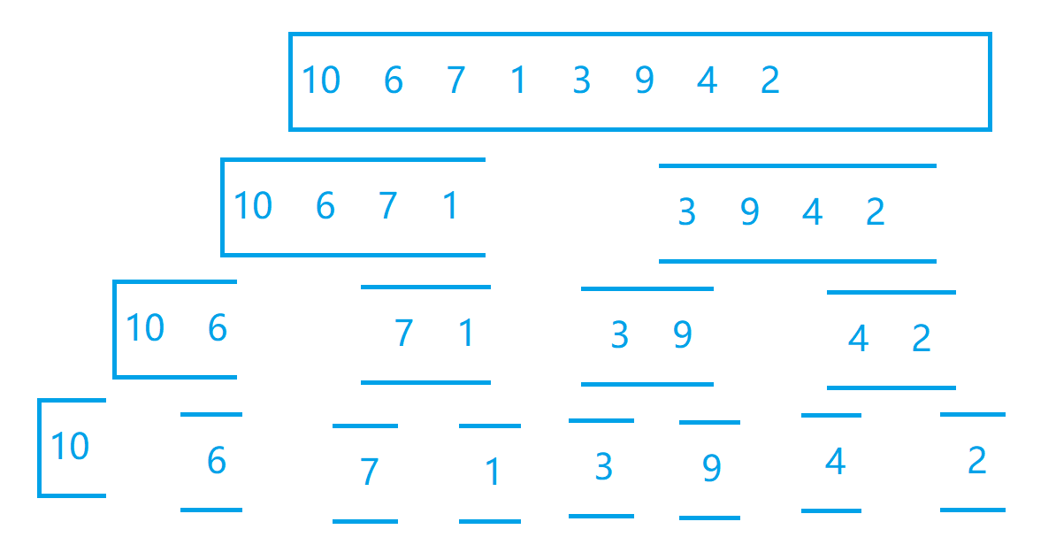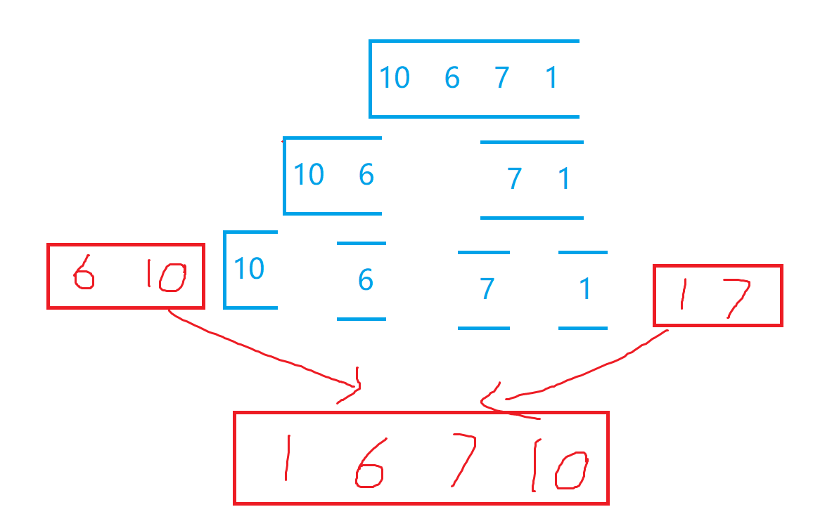 归并排序(MERGE-SORT)是建立在归并操作上的一种有效的排序算法,该算法是采用分治法的一个非常典型的应用;即先使每个子序列有序,再使子序列段间有序,再将两个有序表合并成一个有序表,称为二路归并。来画图理解一下!