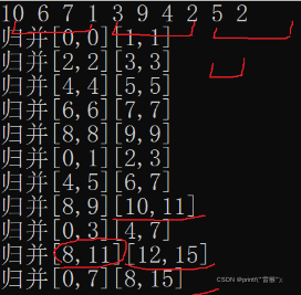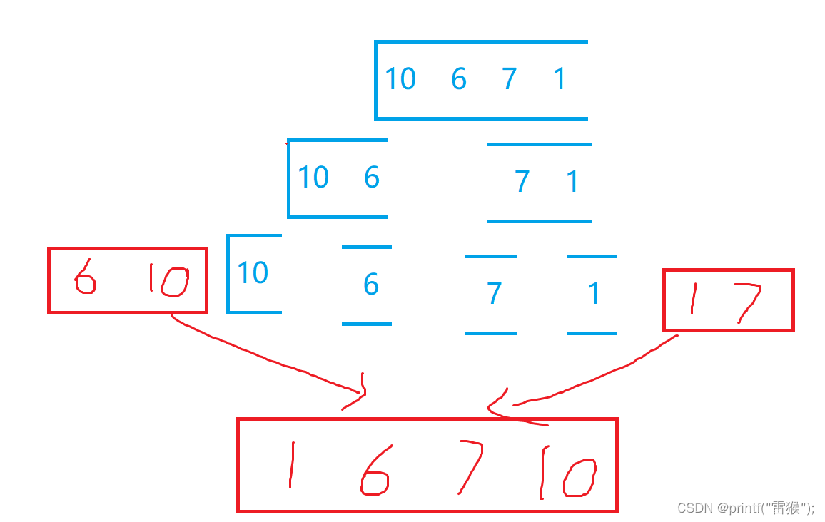 {if (begin >= end)return;int mid = (end + begin) / 2;_MergeSort(a, tmp, begin, mid);_MergeSort(a, tmp, mid+1, end);int begin1 = begin;int end1 = mid;int begin2 = mid + 1;int end2 = end;int index = begin;while (begin1 <= end1 && begin2 <= end2){if (a[begin1] < a[begin2]){tmp[index++] = a[begin1++];}else{tmp[index++] = a[begin2++];}}while (begin1 <=end1 ){tmp[index++] = a[begin1++];}while (begin2 <= end2){tmp[index++] = a[begin2++];}memcpy(a+begin, tmp+begin, sizeof(int) * (end - begin + 1));
