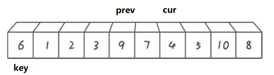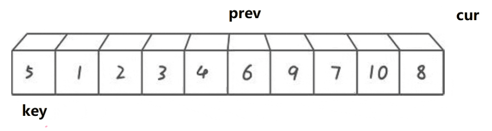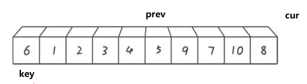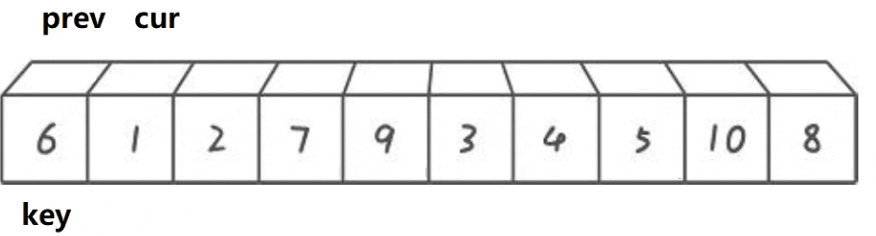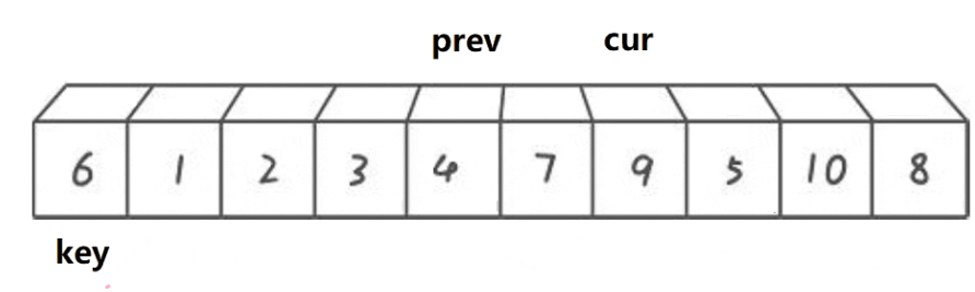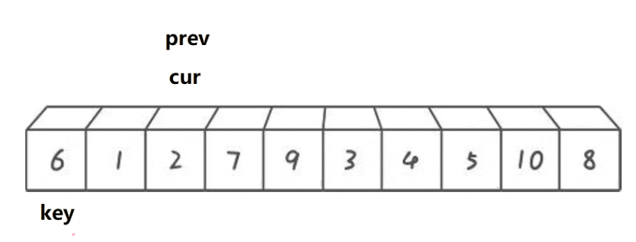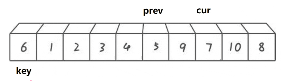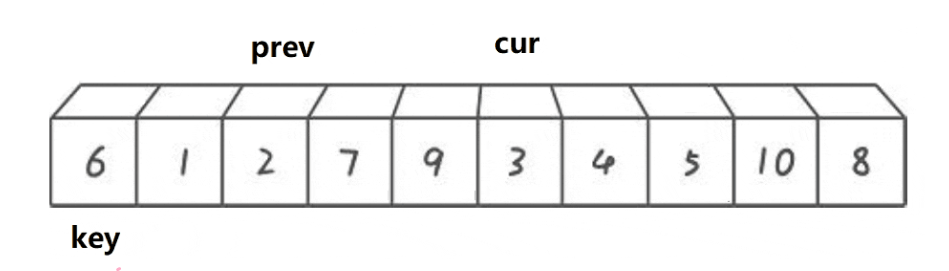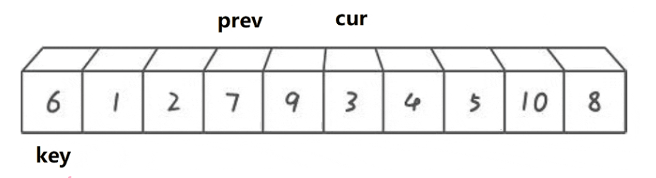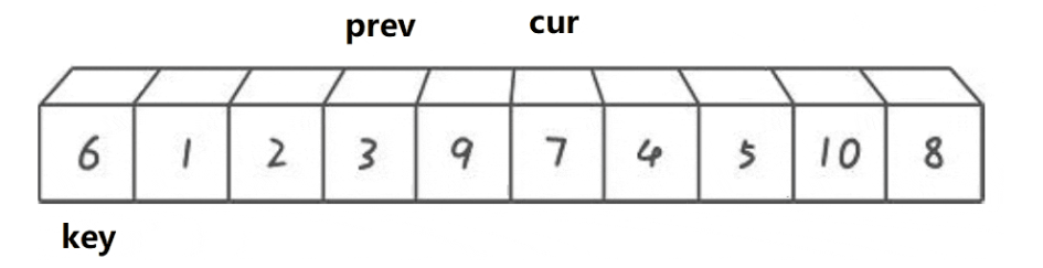 {for (int i = 0; i < n - 1; i++){int end = i;int tmp = a[end + 1];while (end >= 0){if (tmp < a[end]){a[end + 1] = a[end];--end;}else{break;}}a[end + 1] = tmp;}
