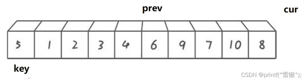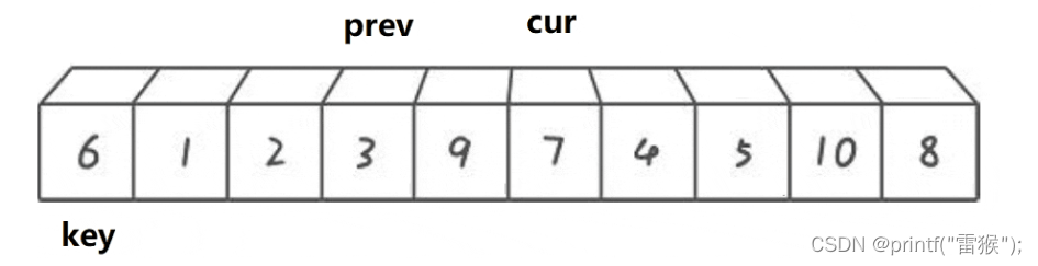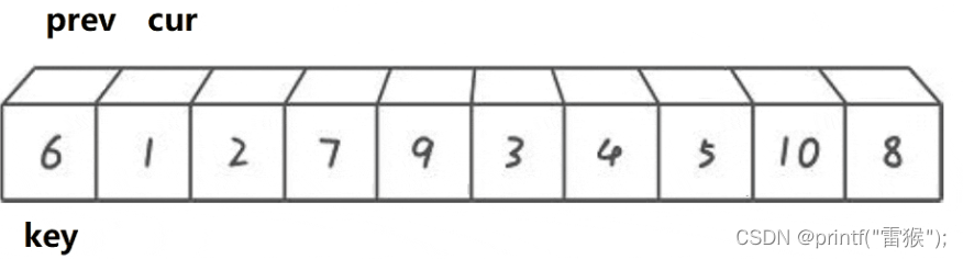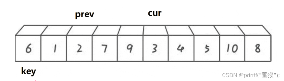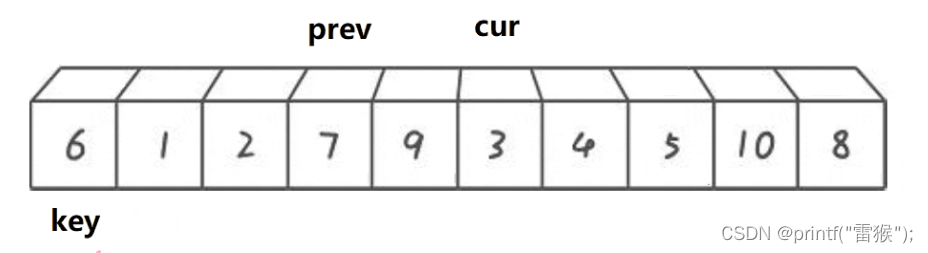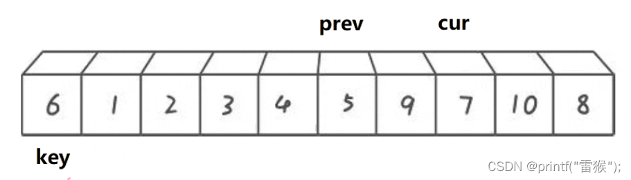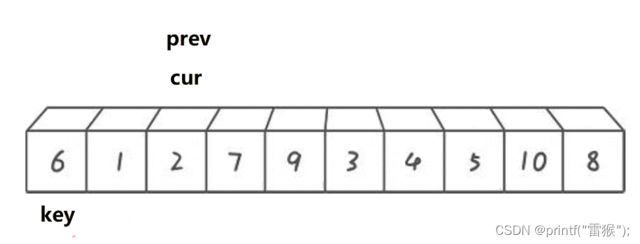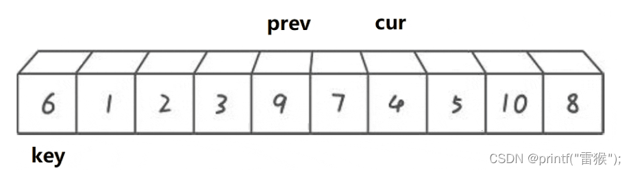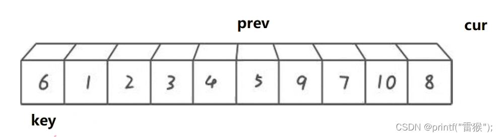 这里我们看一下两个小兵找小和找大循环的判断条件,加了left 如果所有的数都比key大,那么右边的小兵就一直无法完成任务,一直往左边走,直到最后数组越界,还是没有找到,造成程序崩溃,因此要加这个限制条件。 第二个限制条件也一样,如果一个待排序数组全部都是一样的数,那么右边的小兵是不是也无法完成任务了,和上面一样,因此也要加这个限制条件。 再来看一个差不多思路的版本 2.挖坑法 我们还是以左边为key,不过这次这个key直接存着最左边的值,作为一个临时变量使用,这样最左边的数据有了临时拷贝我们就在最左边挖一个坑,左边有坑,左边的小兵当然不能走了,右边的小兵开始走,任务还是一样,找小,当找到后左边的小兵接收到这个数,就把这个数放到左边的坑里面,同时把坑填好,右边的小兵在自己的位置挖坑,然后左边的小兵出发找大,找到后给右边的小兵,右边的小兵把这个大的数放在自己的坑里,然后填坑,左边的小兵挖坑,再重复上述步骤,直到两个小兵相遇,相遇后把我们实现存储的最左边的值放到这个最后的坑里,这样就完成了。还是画图理解一下,我们用黑色代表坑所在的位置 右边小兵出发找小 找到后给左边小兵,然后挖坑,左边小兵填坑。 左边小兵出发找大 然后给右边小兵,左边小兵挖坑,右边小兵填坑。 右边小兵出发找小,和左边小兵相遇 这里其实还进行了挖坑填坑的处理,只不过因为两个小兵相遇了,所以看不出来。 交换相遇位置和存储的key值,也就是把key填入最后的坑里 顺利完成任务了,挖坑法比上一种方法较好理解,不需要理解为什么右边先走,因为左边有坑,左边的小兵是走不了的,因此右边小兵先走是显而易见的。下面来看代码的实现 判断条件和第一种一样,两种方法其实差不多。 最后来看一种效率最高但也是最难理解的方法 3.前后指针法 我们还是定义一个在后面的指针在开始时指向最左边,一个在前面的指针指向第二个数据,也就是最左边的下一个位置,然后还是定义一个key指向最左边,让右边cur指针去找小,如果找到小了,先让左边的prev指针往右走一个,然后交换左右指针所在位置所指的数,然后让右边指针再出发去找小。最后右边指针全部走完(遍历完数组后)让左边指针所在位置所指的数和key值所指的数交换即可。听着有点抽象,下面好好画一下图。这里我们换一组便于理解的数据来画图。 cur指针出发找小,碰巧的是一开始就找到了,让prev++,那么cur和prev就在一个位置了,交换与否都一样(在写代码的时候对这里进行优化),再让cur继续找,cur找到了2,再让prev++,这样prev从1走到了2,再(交换) 然后cur继续找小,找到3停下 让prev++ 交换两者的值 cur再出发找小,找到4,然后prev++ 交换 cur再出发找到了5,继续上述步骤,此处省略,直接出结果 cur继续出发找小,没找到 交换prev和key的数 这样完成后最终我们所选的key6左边的都是比6小的,右边都是比6大的,是不是非常神奇。 这种方法的精髓就在于,我们让cur去找小的过程,如果cur找到的是大,那么prev是不会动的,只有当找到后,再让prev++,然后交换,这样做就让cur和prev之间拉开差距,而这段”差距“区间存的数,就都是比key大的数,细细体会一下。 来看代码 这里我们加了一个判断,如果++prev指向的值等于cur指向的值后,那么就不进行交换了。剩下的都和我们上面分析的思路一致,这里注意如果&&左边判断为假则不会执行右边的表达式了,因此只有在cur找到了小以后才会把prev++ 告诉自己再学亿点点!! 快排快排,固然是很快,但就算是快排也是有缺点的,就比如我们排一个数据全部是一样的数组,或者一个接近升序的数组,我们假设我们运气很差,每次都选左边选key,恰好这个key是最大或者最小的数,那么这样的话是不是每排一次都要计算n次,那排好的时间复杂度就是O(N^2),因此我们不能每次都选最左边做key,这里我们采用三数取中,即比较最左边,最右边和中间的数,取三个数中中间大小的那个数做key。 还有一种优化方法,当我们排序递归到小的子区间时,考虑使用插入排序,设想我们要排4个数,那如果用快排,假设我们每次key划分区间都是严格二分,那这4个数要排好就要把左边2个数和右边2个数排好,左边2个数排好要再划分成1个数和1个数,分别排好返回,右边也是一样,这样相当于15次左右递归,而且递归层数太深的话会造成栈溢出。因此我们用插入排序(用希尔排序就大题小用了这里)对区间较小的数进行直接排序 快排的非递归实现要用到我们之前写的栈,用数据结构栈模拟我们内存中的栈,对栈不太了解的可以去看一下我的这篇博客吃饭的时候也能学的栈和队列 我们先看一下代码 其实和递归的思路是一样的,我们先把左右两个数作为一段区间压入栈,然后循环,在栈不为空(也就是还有区间没有排序完成)的情况下,先取出区间右端点,再取区间左端点(栈先入后出),然后对这段区间进行排序,再将key值左边的区间和key值右边的区间进行排序即可。 快速排序的特性总结: 基本思想: 我们要排这一组数据,那么就把这段区间分成左右两部分,分出来的子部分也进行同样步骤,直到无法再分(只有一个数就相当于有序了) 然后再进行合并,也就是新开辟一块空间,比较两段小区间中的数,依次找出较小的数,放到新空间中,如果一个区间没有数了,就把另一个区间的全部数直接放到新空间,再把新空间的数据拷贝给原数组,那么