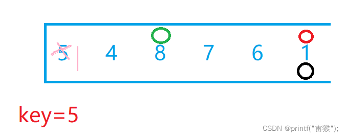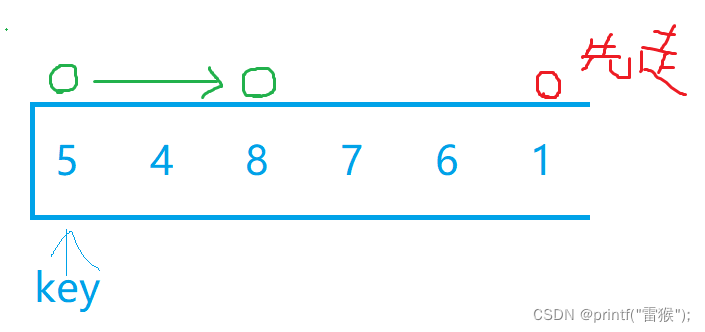 为什么呢,我们看刚刚的情况,当右边的小兵第二次开始走的时候,直接就走到了左边小兵第一次停下的地方,也就是说左边小兵还没有走,两个小兵就已经相遇,那这个相遇位置有什么特点?那就是相遇位置一定是比key小的数,因为左边小兵要停下,那么就一定要找到了比key大的数,然后和右边小兵找到的比key小的数交换,这样一来最后左边小兵所在位置一定是比key小的数,那有没有可能右边小兵停下后左边小兵没有找到比key大的数,而一直走到和右边小兵相遇呢?当然有