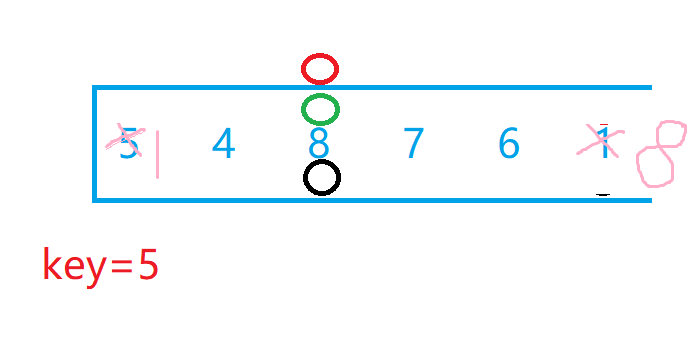 右边的红色小兵先走,比key所在位置5小,停下,左边小兵开始走,找比key所在位置大的