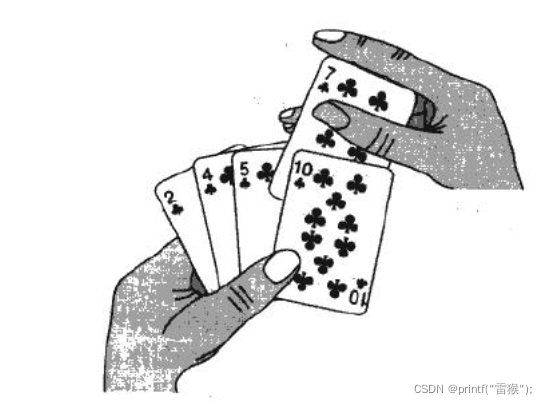 把待排序的记录按其关键码值的大小逐个插入到一个已经排好序的有序序列中,直到所有的记录插入完为止,得到一个新的有序序列 。例子:我们玩扑克牌洗牌的时候
