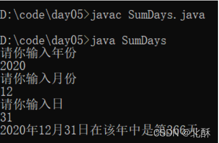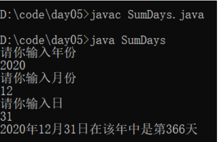 import java.util.Scanner;class SumDays{public static void main(String[] args){Scanner scan = new Scanner(System.in);System.out.println("请你输入年份");int year = scan.nextInt();System.out.println("请你输入月份");int moth = scan.nextInt();System.out.println("请你输入日");int day = scan.nextInt();int sumDays = 0;switch(moth){case 12: sumDays += 30;case 11: sumDays += 31;case 10: sumDays += 30;case 9: sumDays += 31;case 8: sumDays += 31;case 7: sumDays += 30;case 6: sumDays += 31;case 5: sumDays += 30;case 4: sumDays += 31;case 3:if((year % 4 == 0) && (year % 100 != 0) || year % 400 == 0 ){sumDays += 29;}else {sumDays += 28;}case 2: sumDays += 31;case 1: sumDays += day;System.out.println(year + "年" + moth + "月" + day + "日"+ "在该年中是第" + sumDays + "天");}}}