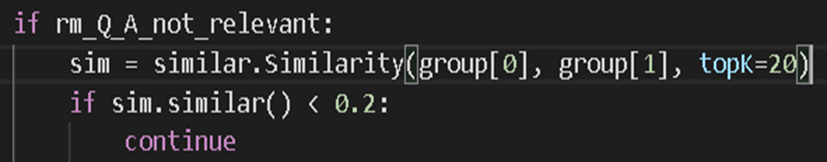 对于语料集质存在答非所问,有缺失的情况,模型不具备纠正这些错误的能力,而是把这些错误学会了,因此,预测时输入错误对话组的提问,模型输出就不像人话了。那么如何判断对话组是否是答非所问呢?可以通过提问句与回答句的相似度来判断,如果相似度大于阀值(一般0.1-0.3),可以认为提问句与回答句是相关的。python代码如下: