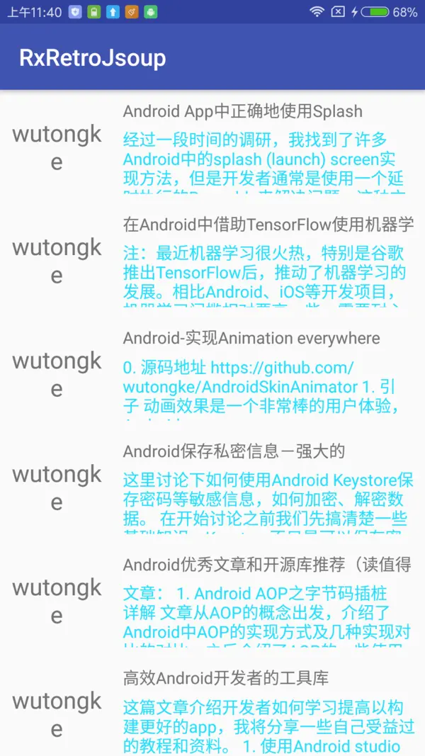 **RxRetroJsoup**不仅仅是解析html,可以通过注解直接从html中创建java对象,理论上只要愿意花时间就可以把任意web网站clone为本地应用。其解析规则可以参考jsoup.org/cookbook/ex…。下图是个人随手写的一个demo示意图(把简书个人页的文章列表做了一个list,不过界面丑的令人发指):