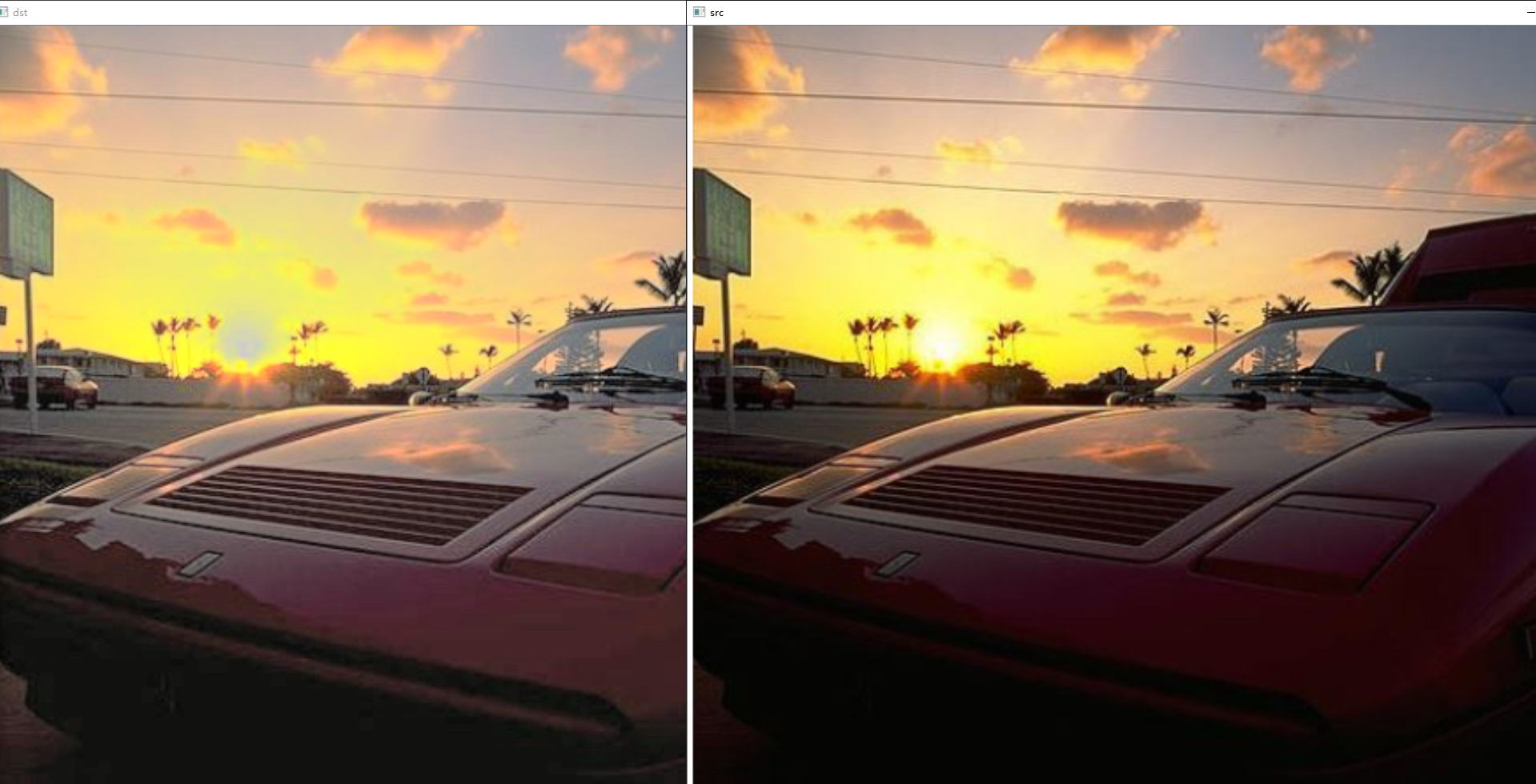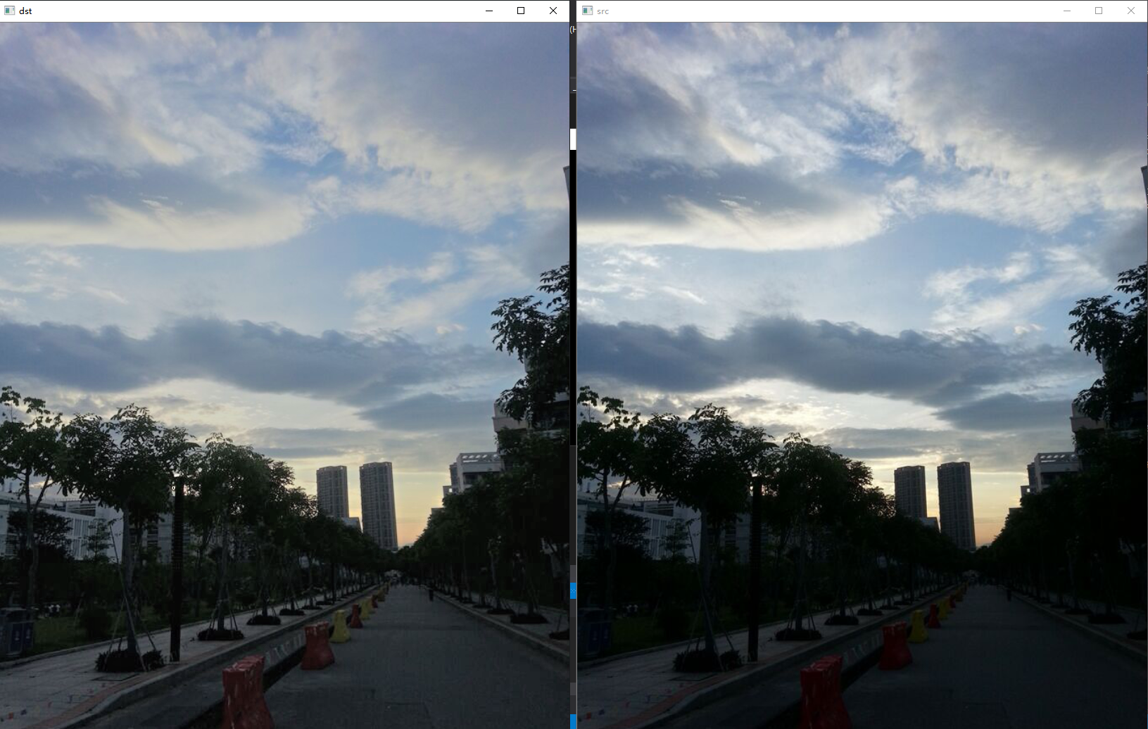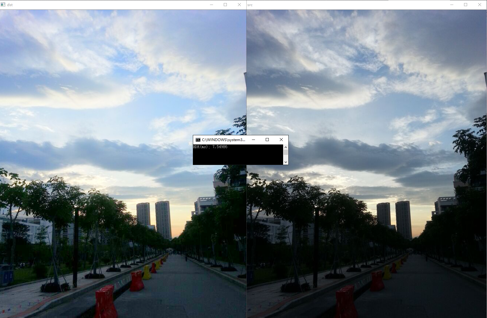 #endifLw_max = max(val, Lw_max); // 公式 4 中的 Lw_max}}//std::cout << "Lw_max; " << t.elapsed() << std::endl;// -----------------------------------------------------------------------//t.restart();// Lw_sumfloat Lw_sum = 0;for (int i = 0; i < rows; i++){float *ptr = Lw.ptr(i);for (int j = 0; j < cols; j++){// .001f 其作用主要是为了避免对纯黑色像素进行 log 计算时数值溢出float val = log(0.001f + ptr[j]);Lw_sum += val; // 公式 5 的求和部分}}//std::cout << "sum; " << t.elapsed() << std::endl;// -----------------------------------------------------------------------//t.restart();// Lwaver 公式 5 的倒数float inv_Lwaver = 1.f / exp(Lw_sum / (rows * cols));for (int i = 0; i < rows; i++){float *ptr = Lw.ptr(i);cv::Vec3f *ptr_vec3 = src.ptr(i);//#pragma omp parallel for schedule (dynamic)for (int j = 0; j < cols; j++){float val = ptr[j];float top = log(val * inv_Lwaver + 1);float bottom = log(Lw_max * inv_Lwaver + 1);float Lg = top / bottom;// 低照度的亮度部分比高照度的部分要能得到更大程度的提升,所以对于低照度图,该公式能起到很好的增强作用// 式中使用了全局的对数平均值,这就有了一定的自适应性。float gain = Lg / val;ptr_vec3[j][0] *= gain;ptr_vec3[j][1] *= gain;ptr_vec3[j][2] *= gain;}}//std::cout << "公式 5; " << t.elapsed() << std::endl;src.convertTo(out_img, CV_8UC3, 255.f);return 0;