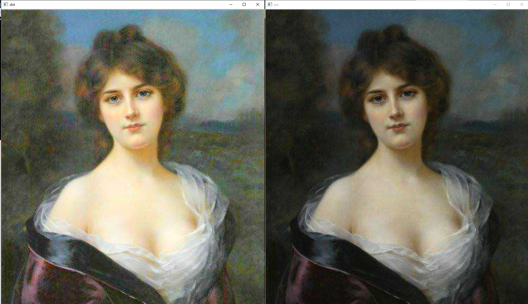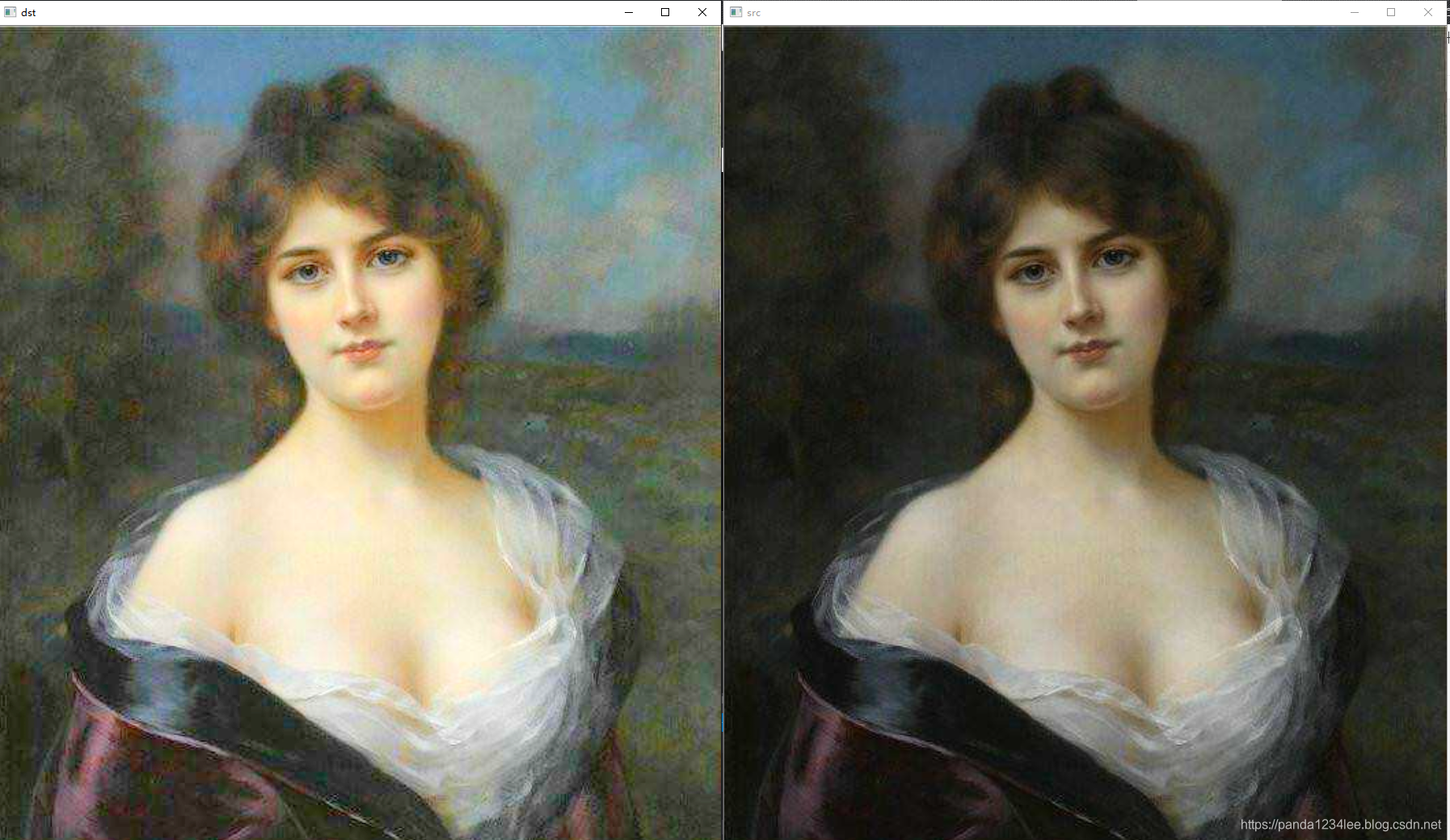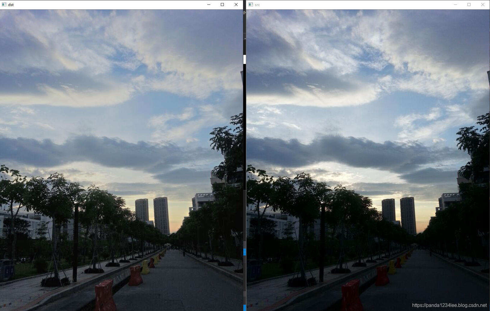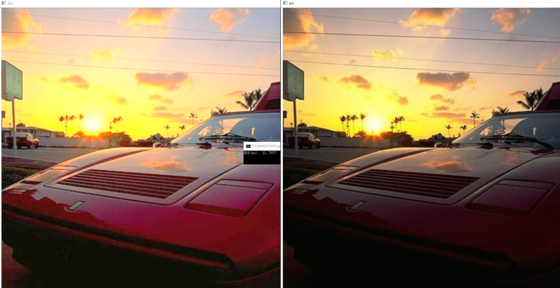 #endifLw_max = max(val, Lw_max); // 公式 4 中的 Lw_max}}//std::cout << "Lw_max; " << t.elapsed() << std::endl;// -----------------------------------------------------------------------//t.restart();// Lw_sumfloat Lw_sum = 0;for (int i = 0; i < rows; i++){float *ptr = Lw.ptr(i);for (int j = 0; j < cols; j++){// .001f 其作用主要是为了避免对纯黑色像素进行 log 计算时数值溢出float val = log(0.001f + ptr[j]);Lw_sum += val; // 公式 5 的求和部分}}//std::cout << "sum; " << t.elapsed() << std::endl;// -----------------------------------------------------------------------//t.restart();// Lwaver 公式 5 的倒数float inv_Lwaver = 1.f / exp(Lw_sum / (rows * cols));for (int i = 0; i < rows; i++){float *ptr = Lw.ptr(i);cv::Vec3f *ptr_vec3 = src.ptr(i);//#pragma omp parallel for schedule (dynamic)for (int j = 0; j < cols; j++){float val = ptr[j];float top = log(val * inv_Lwaver + 1);float bottom = log(Lw_max * inv_Lwaver + 1);float Lg = top / bottom;// 低照度的亮度部分比高照度的部分要能得到更大程度的提升,所以对于低照度图,该公式能起到很好的增强作用// 式中使用了全局的对数平均值,这就有了一定的自适应性。float gain = Lg / val;ptr_vec3[j][0] *= gain;ptr_vec3[j][1] *= gain;ptr_vec3[j][2] *= gain;}}//std::cout << "公式 5; " << t.elapsed() << std::endl;src.convertTo(out_img, CV_8UC3, 255.f);return 0;