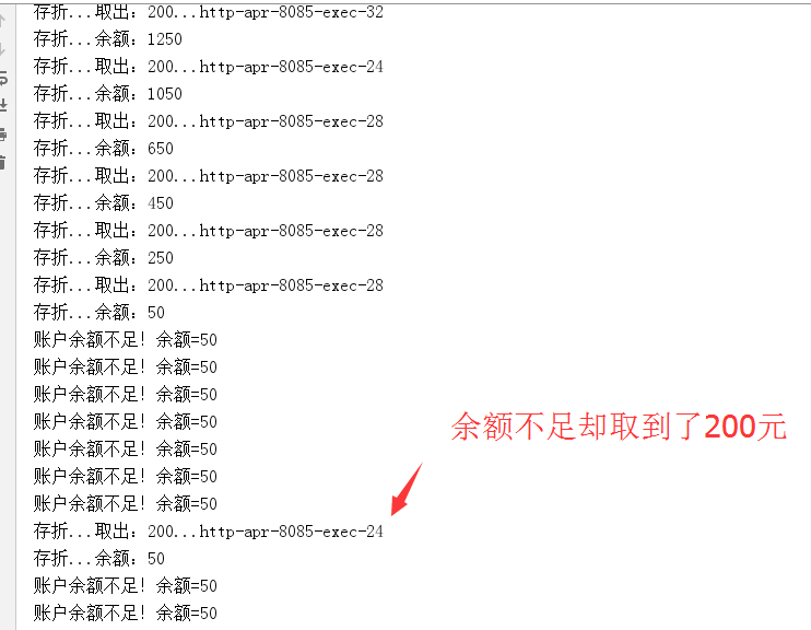 public class Acount3 {private int count = 0;/*** 存钱** @param money*/public int addAcount(String name, int money) {// 存钱count += money;System.out.println(name + "...存入:" + money + "..." + Thread.currentThread().getName());return selectAcount(name);}/*** 取钱** @param money*/public int subAcount(String name, int money) {// 先判断账户现在的余额是否够取钱金额if (count - money < 0) {System.out.println("账户余额不足!余额=" + count);return money;}// 取钱count -= money;System.out.println(name + "...取出:" + money + "..." + Thread.currentThread().getName());return selectAcount(name);}/*** 查询余额*/public int selectAcount(String name) {System.out.println(name + "...余额:" + count);return count;}