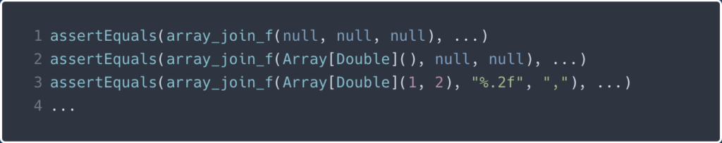 对其建立测试时,可以直接测试内部的转换函数array_join_f,一些示例的测试场景比如: