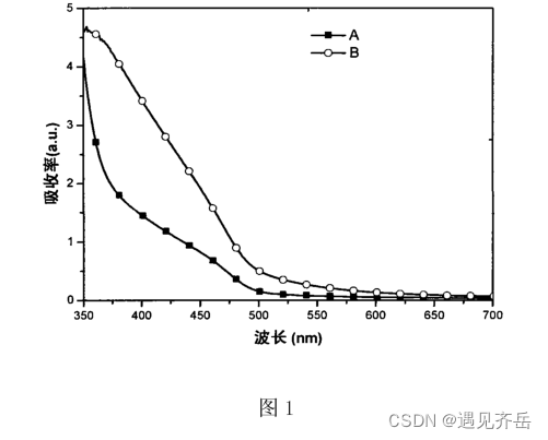 图1为掺杂了Mn原子和Cu原子的CdS量子点与未掺杂的CdS量子点的紫外可见吸收光谱图;其中,A曲线对应于未掺杂的CdS量子点的紫外可见吸收光谱,B曲线对应于锰铜掺杂的CdS量子点的紫外可见吸收光谱;
