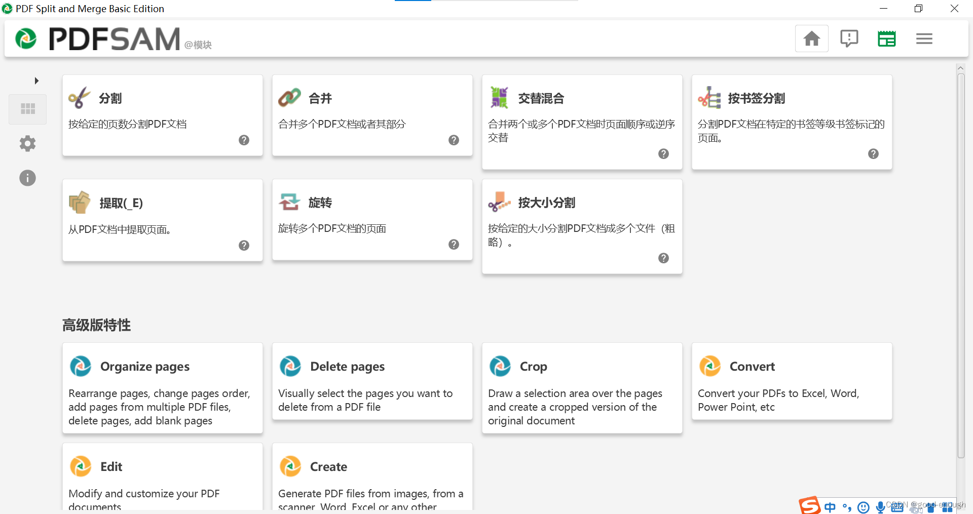 PDFsam 的功能还是蛮多的,可以实现PDF分割、合并、提取页面、混合和旋转等,如下图。