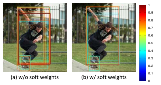 - 因此提出soft-weighted anchor points,对每个anchor point赋予不同的损失权重因子,物体边界框越近的anchor point的损失权重因子越大,这样可以使网络更加关注代表性强的重点区域,而减小对边界区域的关注。