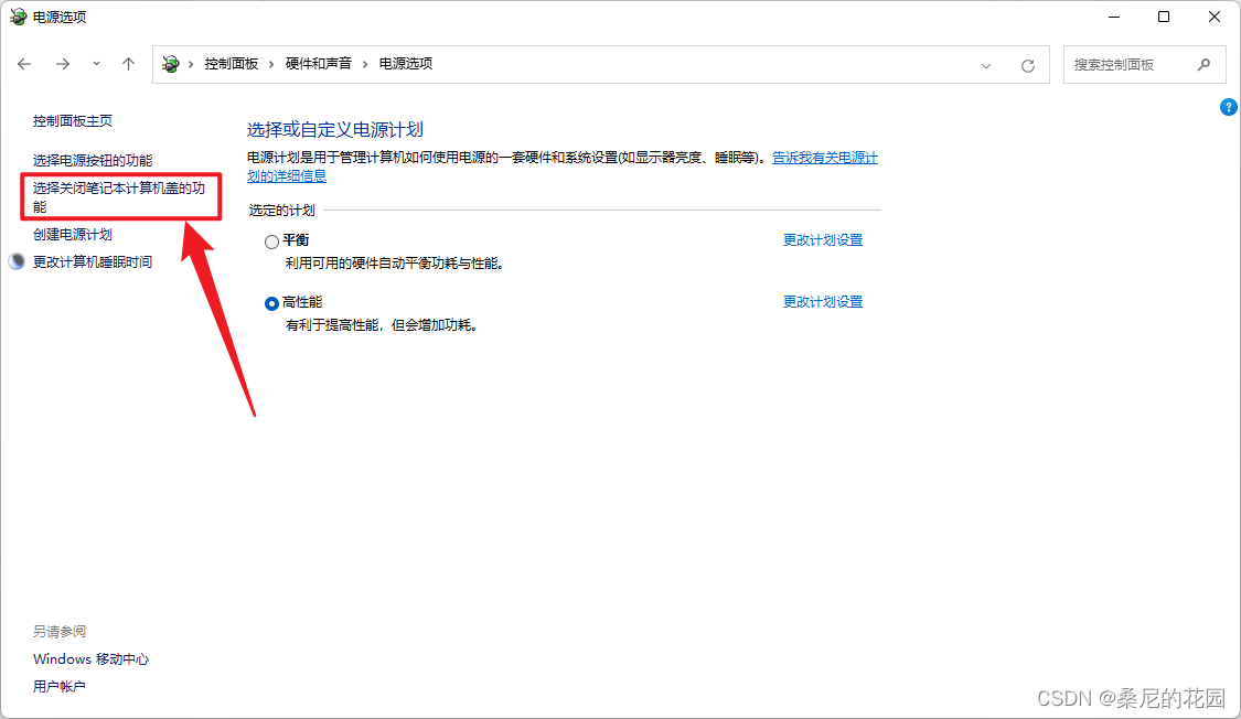 2、进入 “电源选项” → 进入 “选择关闭笔记本计算机盖的功能”