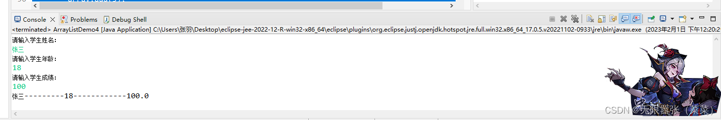 import java.util.Scanner;public class ArrayListDemo4 {public static void main(String[] args) {// TODO Auto-generated method stub//创建集合对象ArrayList array = new ArrayList();Scanner sc = new Scanner(System.in);System.out.println("请输入学生姓名:");String name = sc.nextLine();System.out.println("请输入学生年龄:");int age = sc.nextInt();System.out.println("请输入学生成绩:");float score = sc.nextFloat();students s = new students();s.setName(name);s.setAge(age);s.setScore(score);