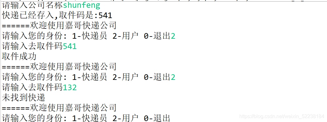 public class kuaidi {public static Scanner input=new Scanner(System.in);public static String[] numberArr=new String[100];//快递单号数组public static String[] companyArr=new String[100];//公司名称数组public static int[] codeArr=new int[100];//可以写成int[]取件码数组public static int index=0; //快递柜中有多少个快递public static Random random=new Random();public static void main(String[] args) {//展示菜单while(true) {int id=startMenu(); if(id==0)return ;}}/*** 开始菜单*/public static int startMenu() {System.out.println("======欢迎使用嘉哥快递公司");System.out.print("请输入您的身份: 1-快递员 2-用户 0-退出");int id=0;do {id=input.nextInt();if(id==1) { //快递员---展示快递员的菜单delivermanMenu();break; } else if(id==2) { //普通用户userMenu();break;}else if(id==0) {System.out.println("谢谢使用");return 0;}else {System.out.println("选择有误!请重新输入");}}while(true);return id;}/*** 普通用户菜单*/public static void userMenu() {System.out.print("请输入去取件码");int code=input.nextInt();int codeIndex=isExist(code);if(codeIndex==-1) {System.out.println("未找到快递");}else {del(codeIndex);System.out.println("取件成功");}}/*** 快递员菜单* */public static void delivermanMenu() {System.out.print("请选择操作如下:1.存快递 2.删除快递 3.修改快递 4/查看所有快递");int id=input.nextInt();if(id==1) {saveExpress();}else if(id==2) {delExpress();}else if(id==3) {System.out.print("请输入要修改的快递单号");String number=input.next();int updateIndex=findByNumber(number);if(updateIndex==-1) {System.out.println("未找到快递");}else {System.out.print("请输入新的快递单号");number=input.next();System.out.print("请输入新的公司名称:");String company=input.next();numberArr[updateIndex]=number;companyArr[updateIndex]=company;System.out.println("修改成功");}}else if(id==4) {printAll();}