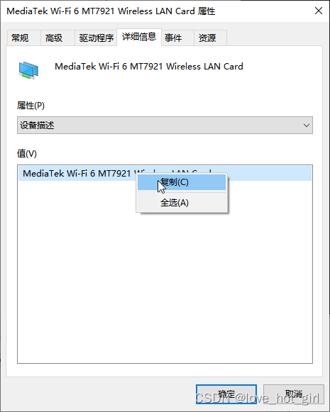 然后在弹出对话框转到,“详细信息”,设备描述,右键复制