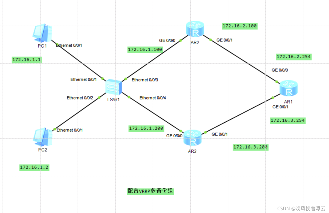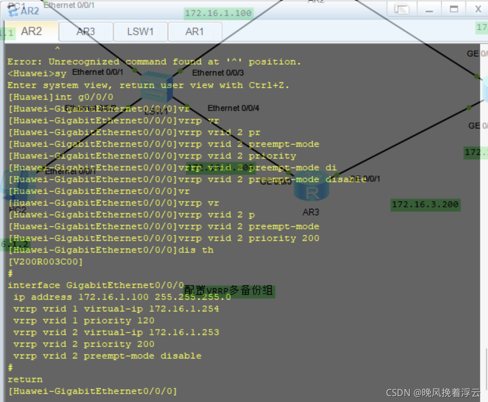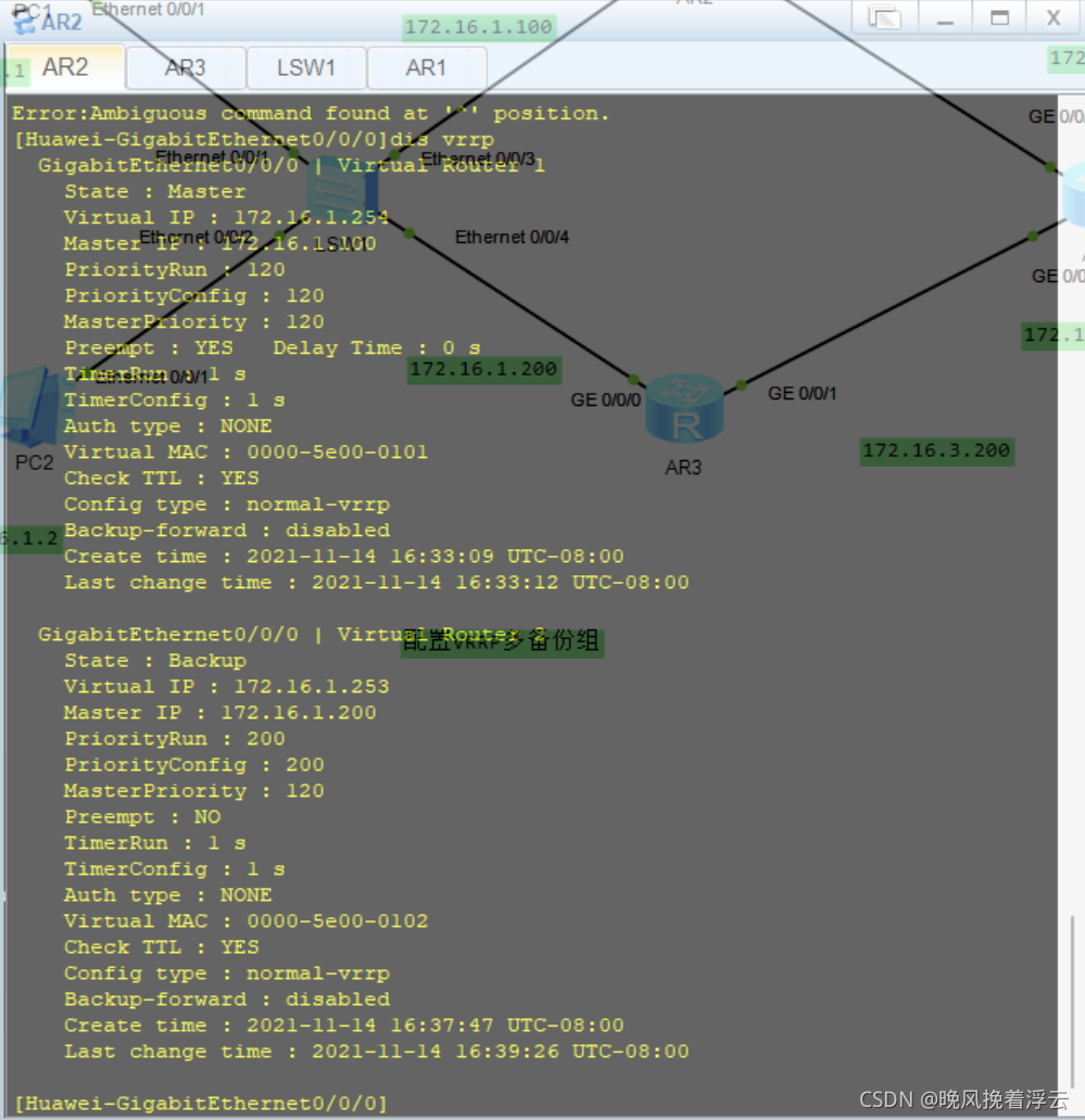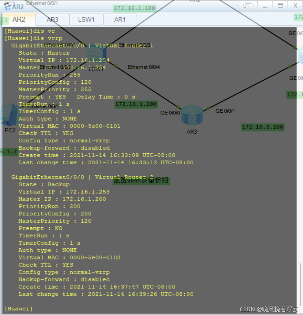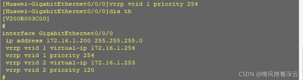 AR2:#interface GigabitEthernet0/0/0ip address 172.16.1.100 255.255.255.0vrrp vrid 1 virtual-ip 172.16.1.254vrrp vrid 1 priority 120AR3:#interface GigabitEthernet0/0/0ip address 172.16.1.200 255.255.255.0vrrp vrid 1 virtual-ip 172.16.1.254