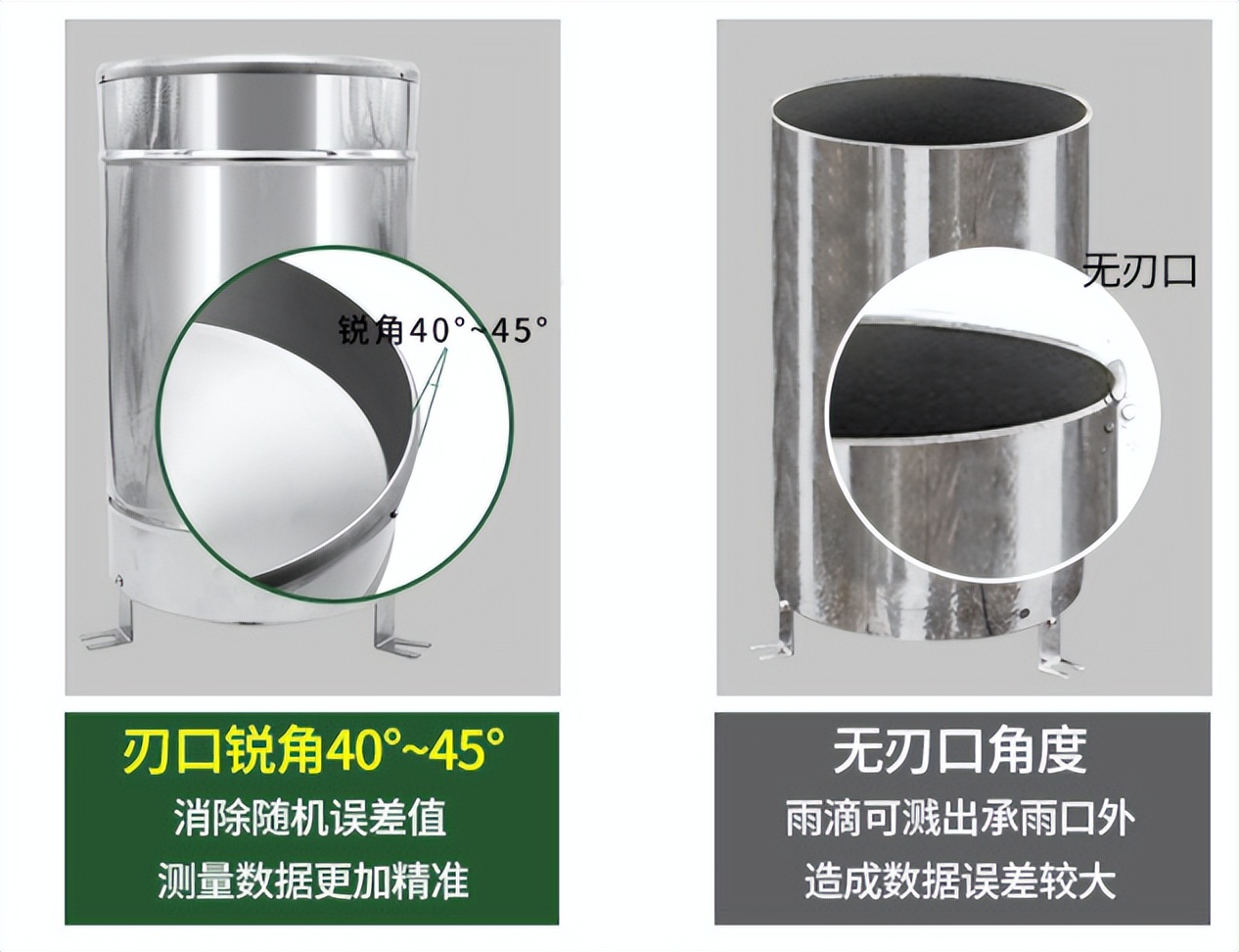 刃口的作用是明确雨滴落在承雨口径或者承雨口径外。根据GB/T 21978.2-2014《降水量观测要求》,设备优先选择筒身为不锈钢材质的,寿命长、耐腐蚀,并且承雨口刃口角度为44°,口缘锋利,其内壁十分光滑,没有砂眼,渗漏等缺点,符合国标要求的才可进行使用。
