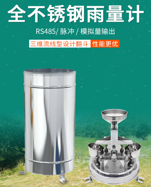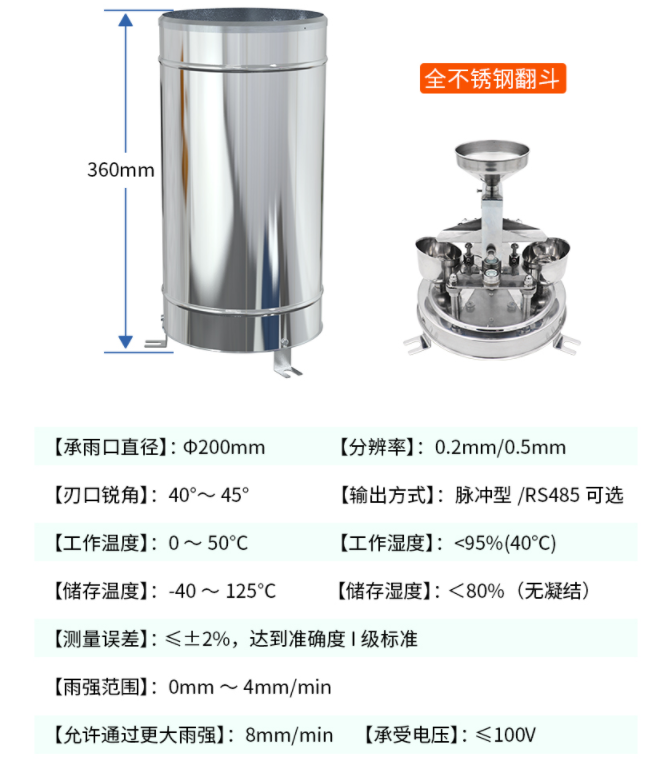 根据国家标准5.4.2的要求,翻斗式雨量计的承雨口内径尺寸为Φ200mm,在此基础上,我们可以选择可以让翻斗翻水更为流畅的三维流线型设计的产品,不锈钢的筒壁,便于应对恶劣环境,寿命不低于7年。