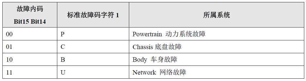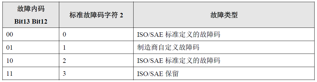 根据ISO 15031-6和ISO 14229-1的故障诊断码格式规定,故障码信息由四字节组成,如下表所示