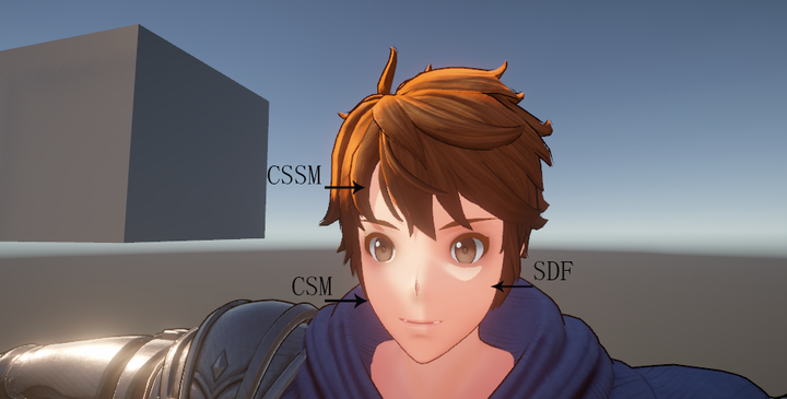 对于角色面部的处理是最细小和繁杂的,并且面部阴影的质量需要达到比较高的程度,因此可能会在不同的阴影方法中动态切换或组合,当前的方案除了使用系统的级联阴影(Cascade Shadow Map, CSM)还会结合面部距离场阴影(Facial Signed Distance Field Shadow, FSDFS)和自阴影贴图(Custom Self Shadow Map, CSSM),无论场景如何,CSM和FSDFS都会默认使用,然后视角色距离主相机的远近程度或上层逻辑选择性使用CSSM。