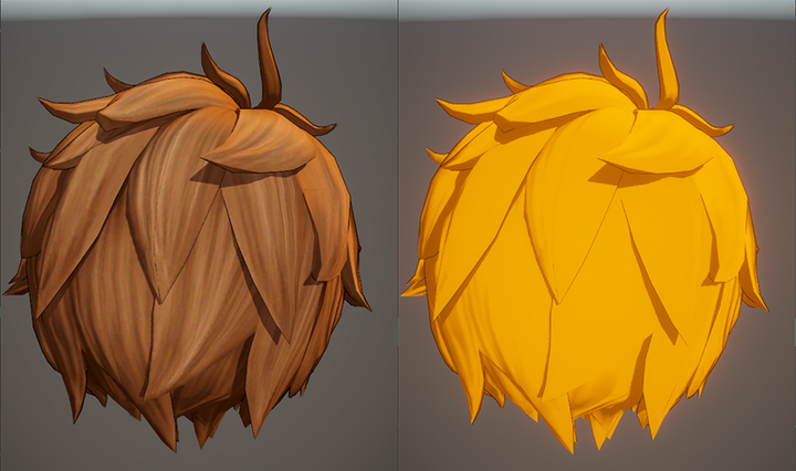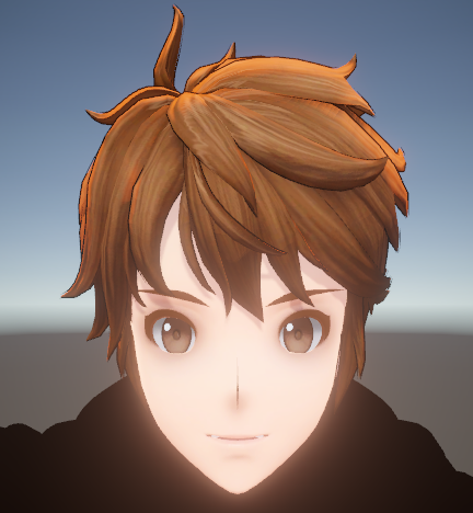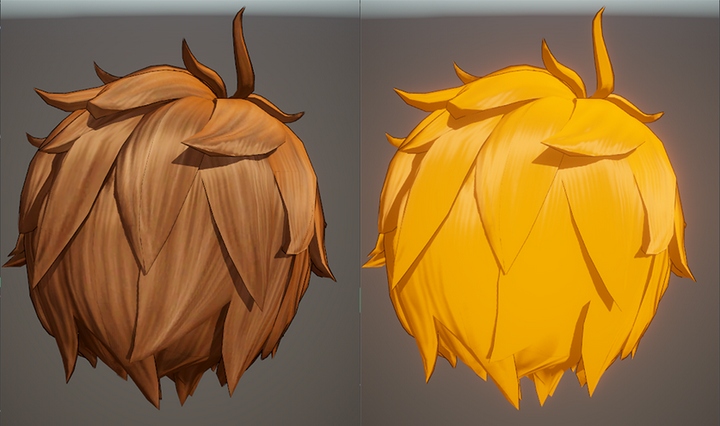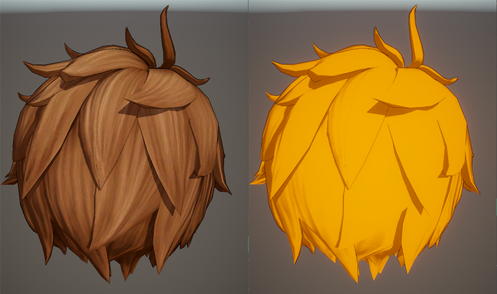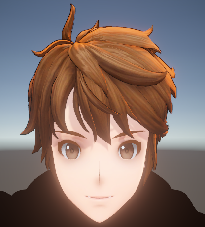 头发的处理相对常规一些,网格模型为了兼容描边使用的是具有体积的Mesh片,光影着色主要由三部分组成,分别是颜色色阶处理、边缘光效果以及天使环效果。