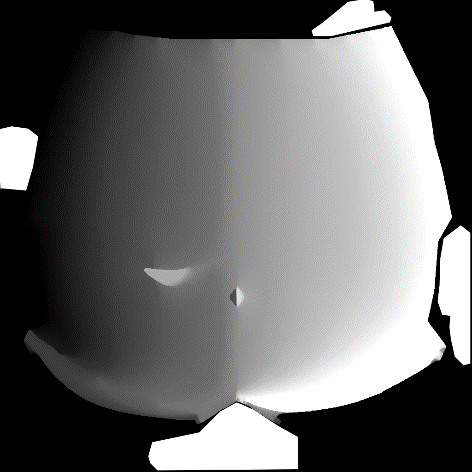 面部距离场阴影会用到一张SDF图,美术制作流程上需要先手绘出0至180度间每隔固定角度下的面部阴影图,然后将这些序列图进行距离场插值处理后生成一张阈值图,具体的做法和插值方法可参照其它关于SDF面部阴影的文章。按照当前角色面部模型UV展开,SDF图如下: