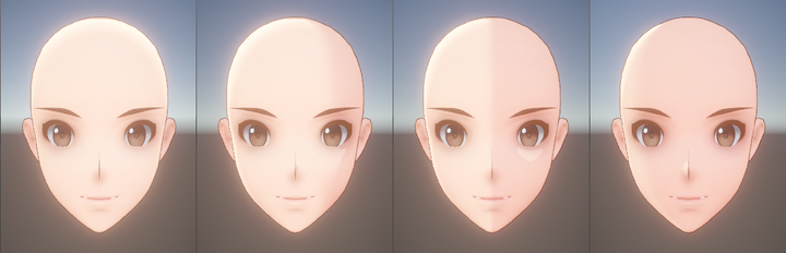 可能还会需要一张额外的额头Mask图来避免阴影拉扯过于不自然,因此在取舍之后决定使用固定方向光照,不再追随场景光源,这一点改动总体来说利大于弊,只需要在角色预制件上调整好固定的偏移角度,就不再需要关心之后如何动态关联光照,并保证了阴影的可控表现。